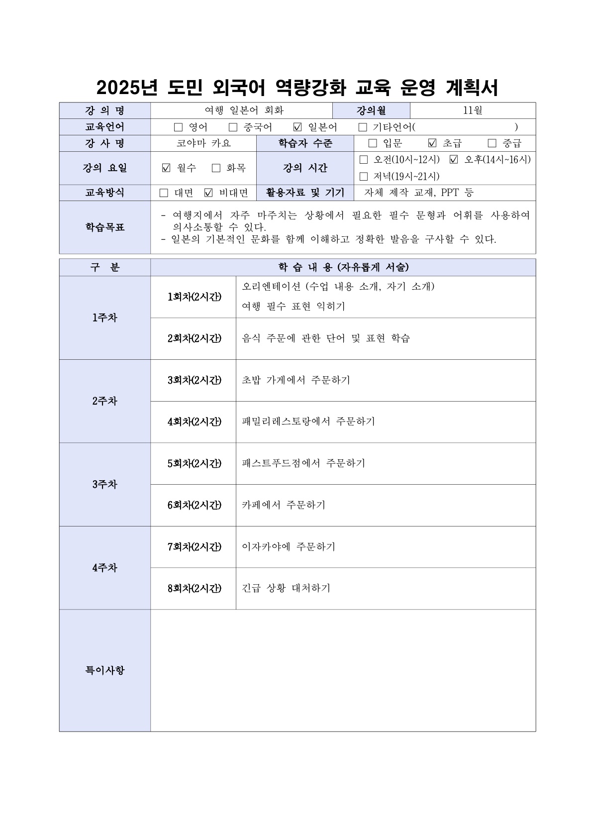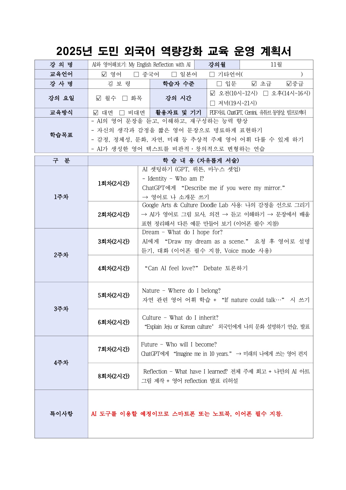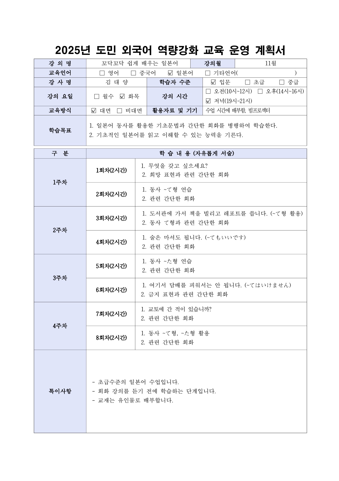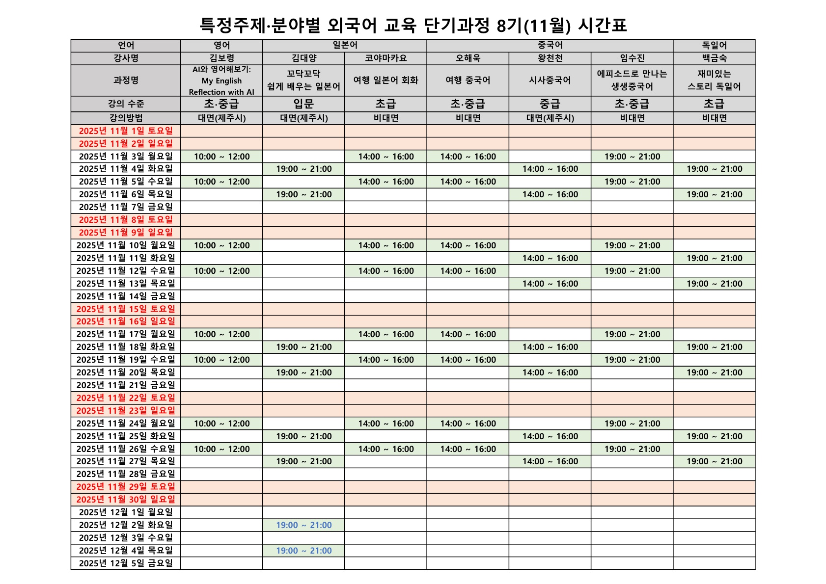 | 「2025³â ƯÁ¤ÁÖÁ¦.ºÐ¾ßº° ¿Ü±¹¾î ±³À°¡¹ ´Ü±â°úÁ¤ 8±â(11¿ù) ±³À°»ý ¸ðÁý | |