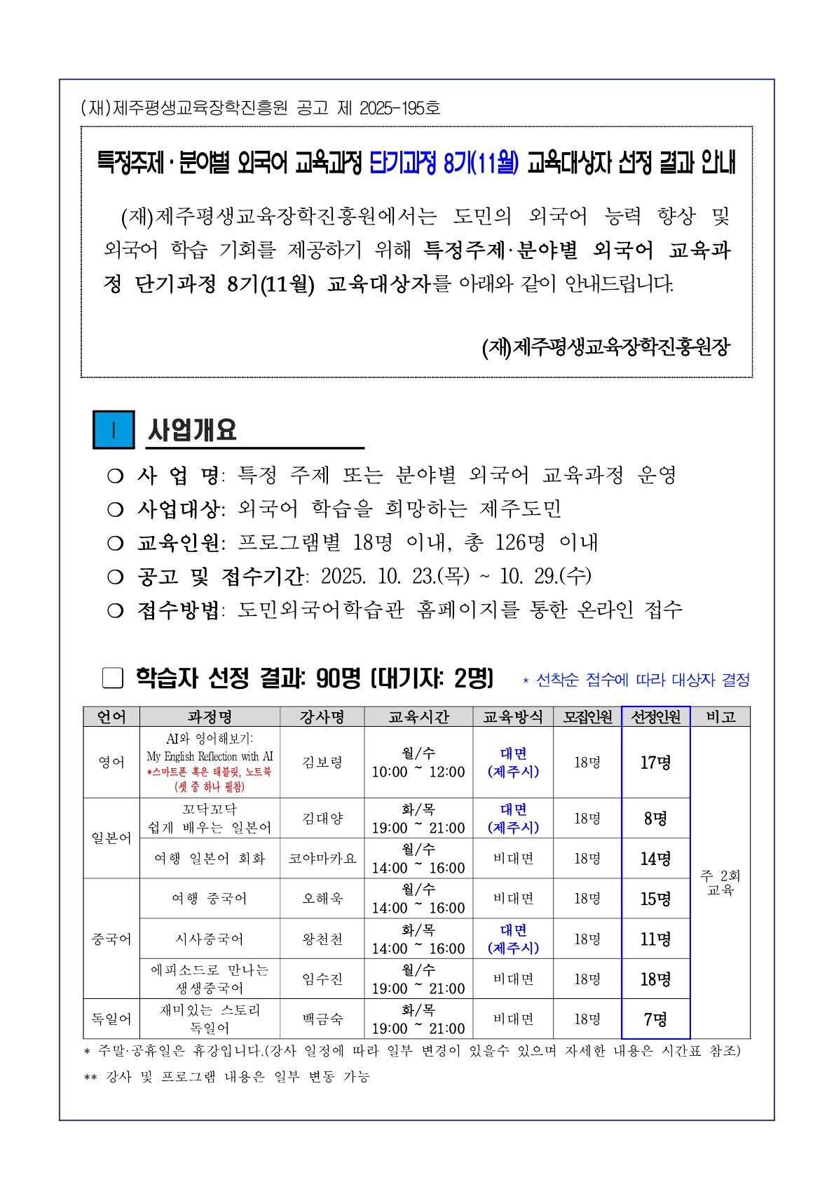 | [8±â(11¿ù) ±³À°´ë»óÀÚ ¼±Á¤ °á°ú] 「2025³â ƯÁ¤ÁÖÁ¦.ºÐ¾ßº° ¿Ü±¹¾î ±³À°¡¹ ´Ü±â°úÁ¤ 8±â(11¿ù) ±³À°´ë»óÀÚ ¼±Á¤°á°ú ¾È³» | |
