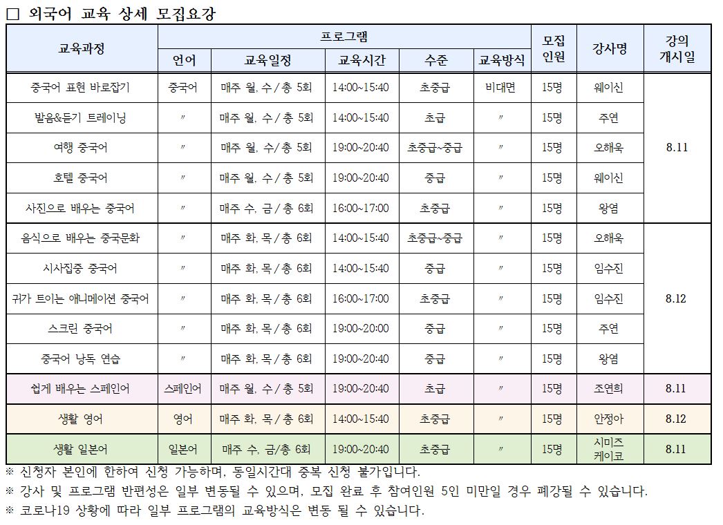 | <¸ðÁý> 8¿ù ÀÌ¿ë ¿Ü±¹¾î ±³À° ¡¼Áß±¹¾î Ç¥Çö ¹Ù·ÎÀâ±â ¿Ü 12°³ ÇÁ·Î±×·¥¡½ ¸ðÁý¾È³» | |