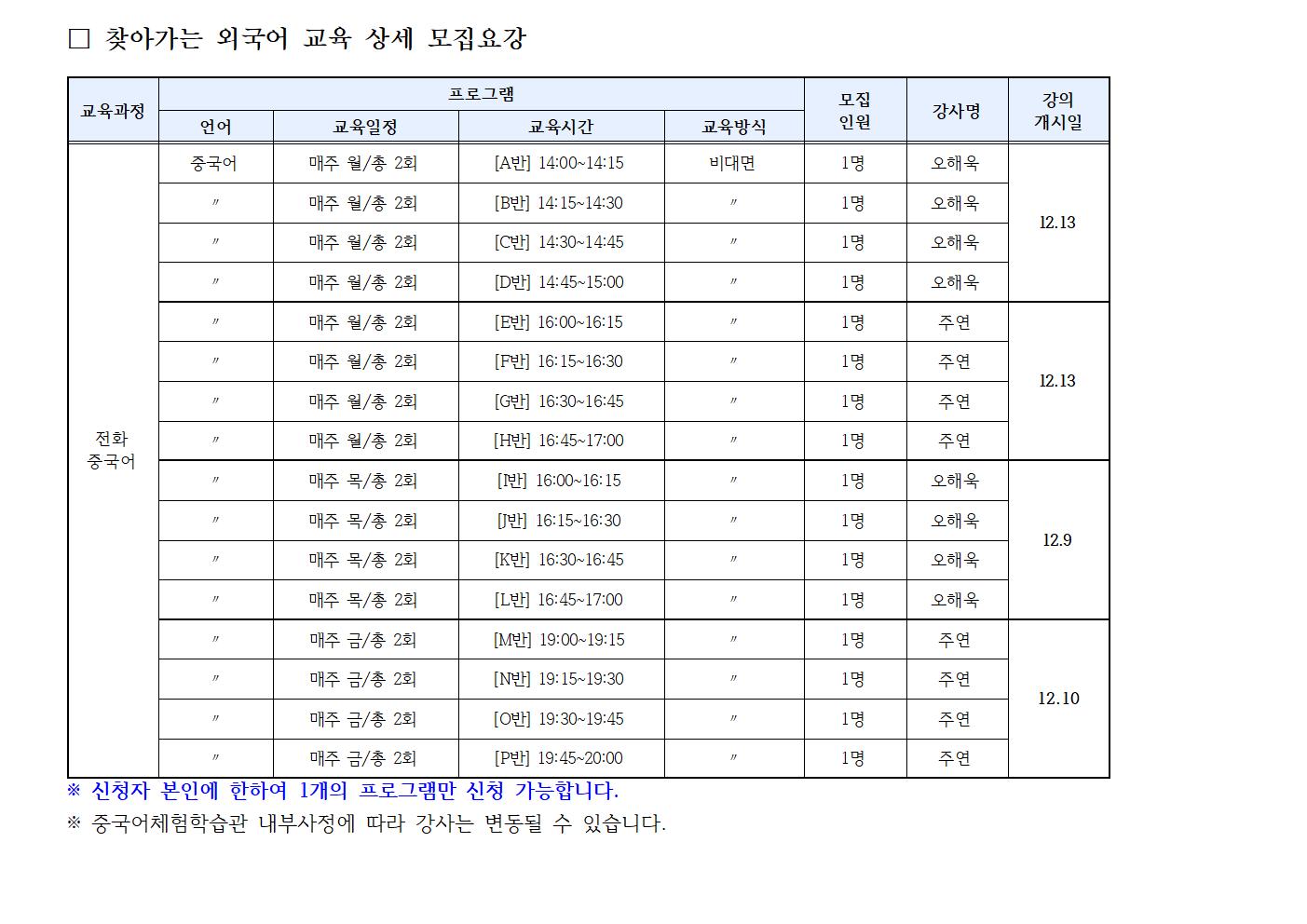 | ´ÙÀ½±Û | <¸ðÁý> 12¿ù ÀÌ¿ë ¿Ü±¹¾î ±³À° ¡¼Áß±¹¾î ³¶µ¶ ¿¬½À ¿Ü 15°³ ÇÁ·Î±×·¥¡½ ¸ðÁý¾È³» |