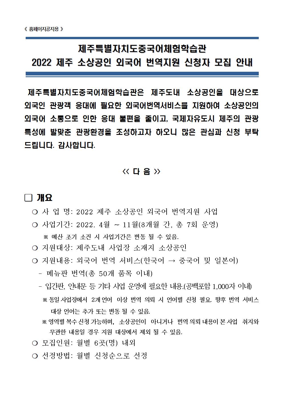| <¾Ë¸²> 2022 Á¦ÁÖ ¼Ò»ó°øÀÎ ¿Ü±¹¾î ¹ø¿ªÁö¿ø ½ÅûÀÚ ¸ðÁý ¾È³» | |
